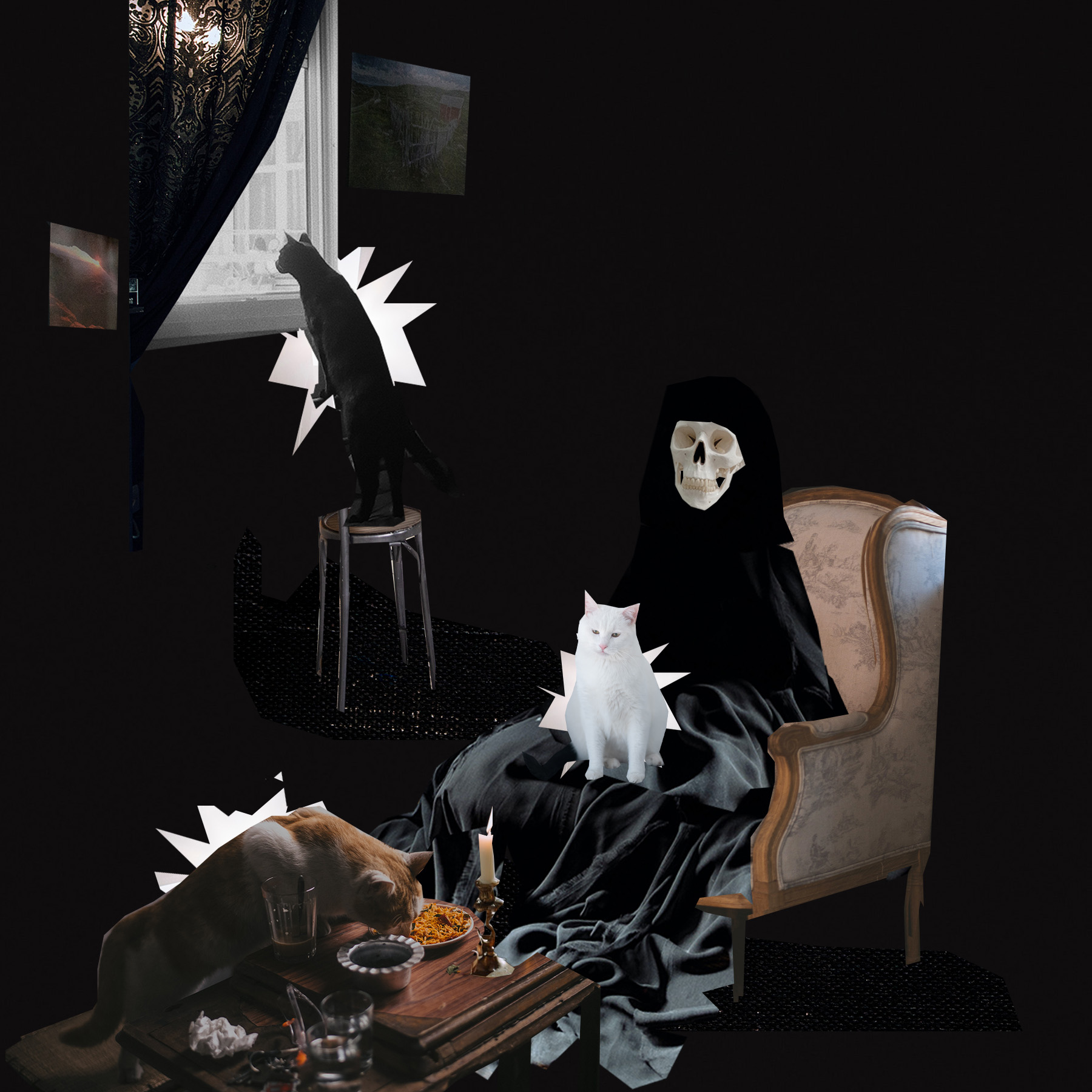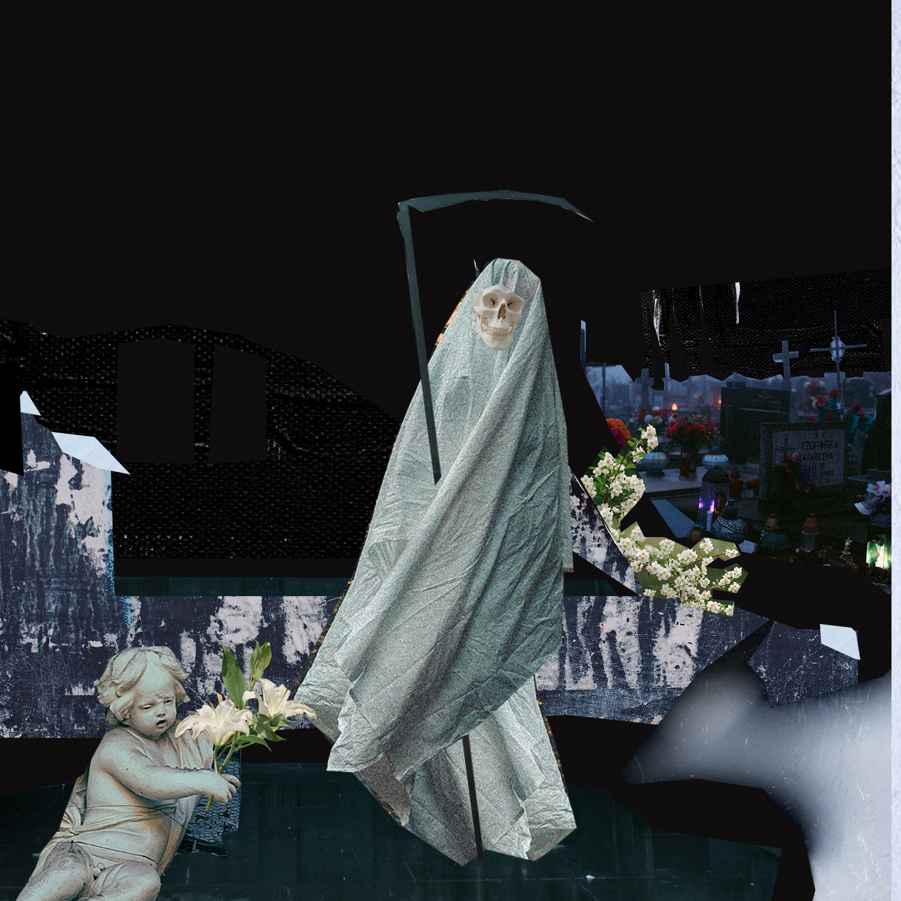 This project currently consists of 10 photomontages that explore how latvians in the 21st century percieve the image of death. The data needed to make photomontages were taken from interviews of research paticipants where they were asked open ended questions that let them describe what they think without the interviewer placing a specific image in their heads of how Death is traditionally described. The interviewed persons perceptions of Death varied according to their own beliefs (religion, philosophy etc.).
